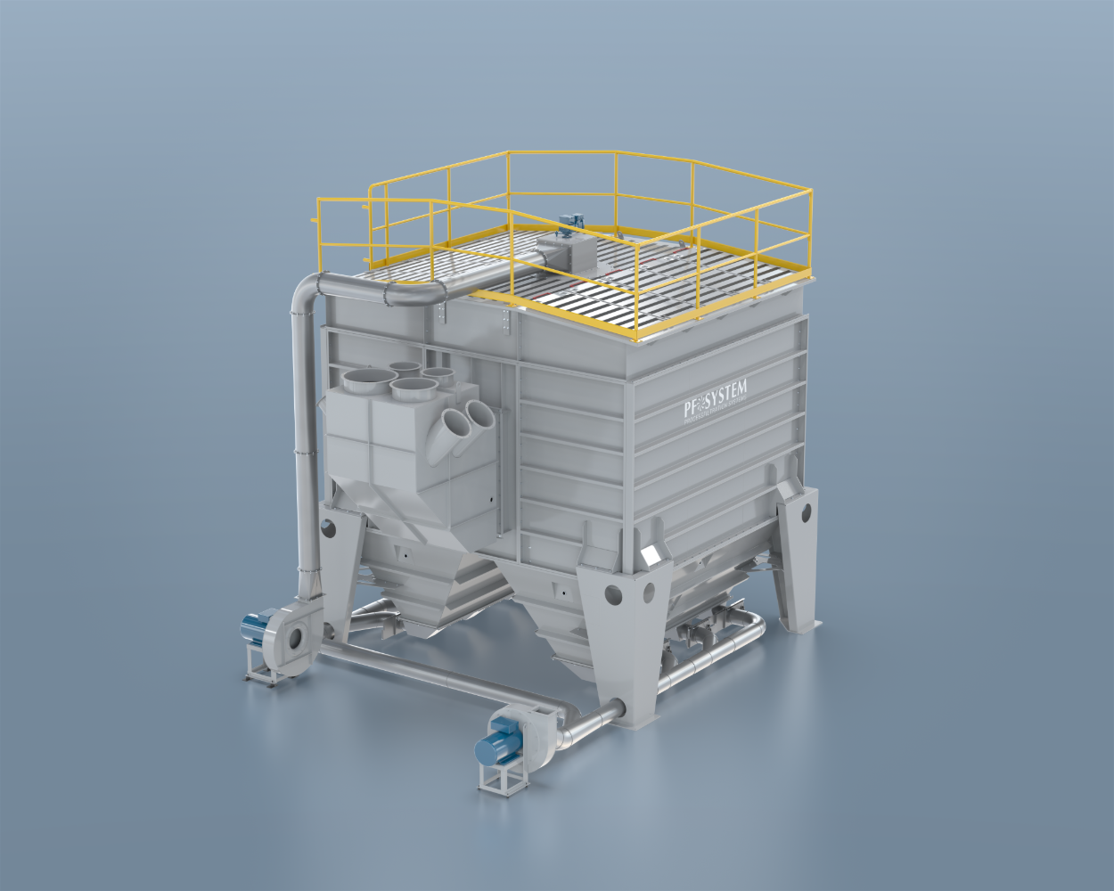 The fine particles are immediately extracted utilizing slide gate valves and a material transport fan. The integral electrical control panel includes PLC and HMI components for all system functions. PF System also supplies peripheral equipment related to the material.